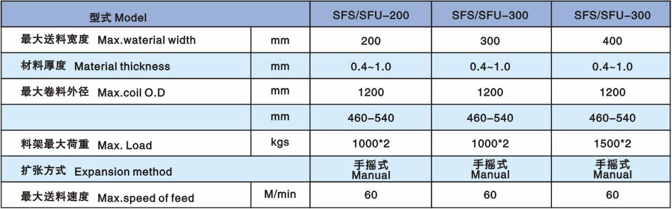 本机型: 高速双头卷料架,操作简易,能与高速冲床性能完全配合,配置齿轮送料机使用效果更佳。客户可根据需要定制左右移动型(特殊配置 1、S型/U型导料系统,采用光电信号→PC→变频器速度转变时,能与冲床完全同步生产,速度可达约60M/min 2、由及精密之INDEXING CAM所组合之GEAR CHANGGE式送料机,送料速度每分钟60公尺时,精度在±0.05mm。 3、双轴180°回转式料架,可采用油压式泵浦扩张,操作简单,工作效率高。